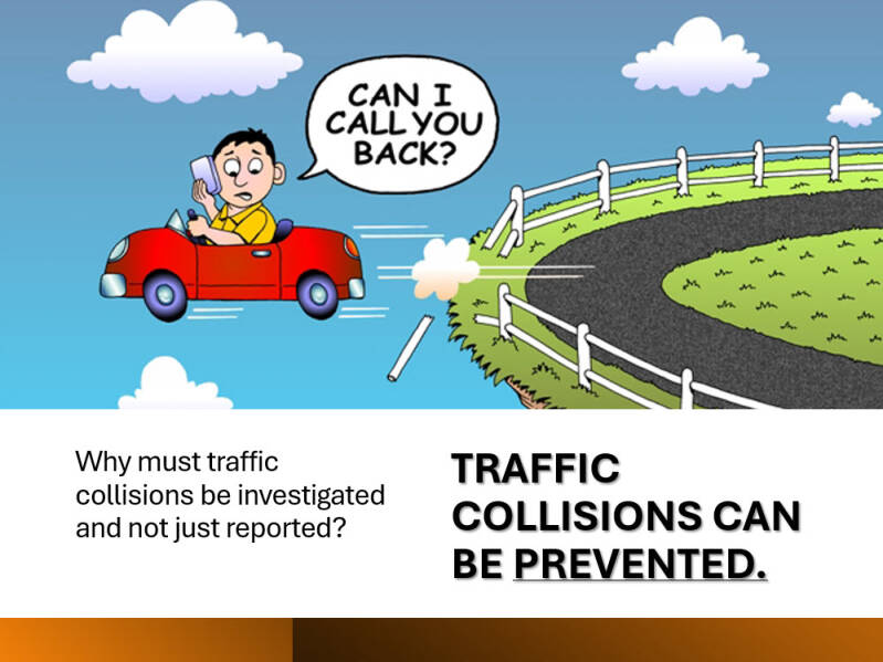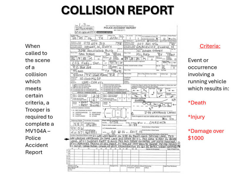 - YOU WILL BE PROVIDED A WORKING KNOWLEDGE OF THE REPORTING REQUIREMENTS ASSOCIATED WITH COLLISION INVESTIGATION.